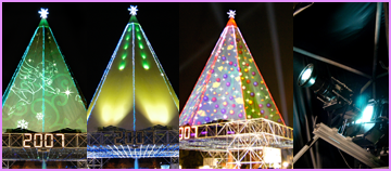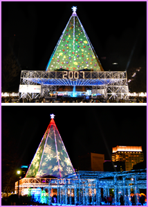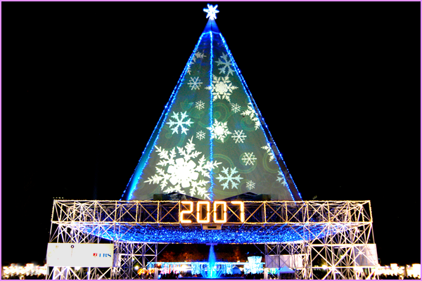 噴水広場に登場した、鉄骨フレームをテントで覆ったクリスマスツリーは高さ約42メートルで、自立式膜構造ツリーとしては日本一。